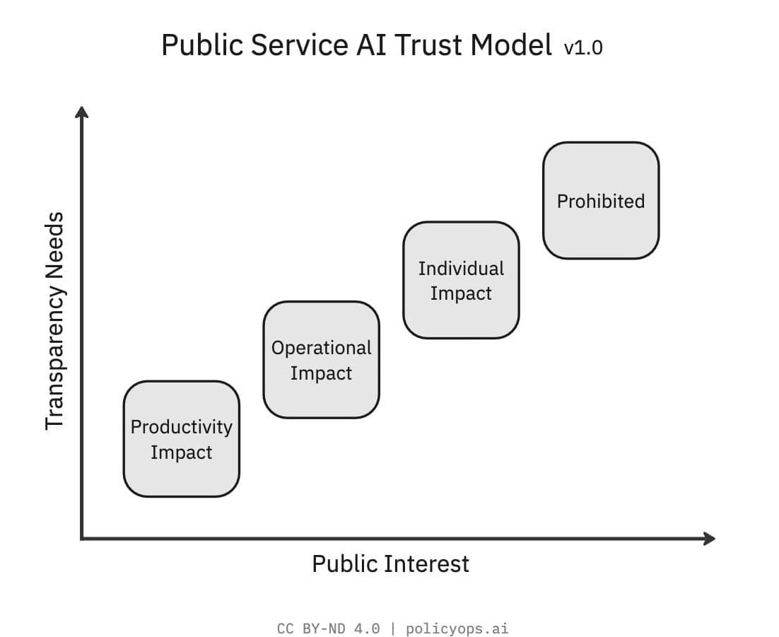 The Public Service AI Trust Model is a tool for communicating within government and to the public. It's offered for discussion as working-version 1.0, under Creative Commons BY-ND 4.0 (free for use without adaptation, with attribution).